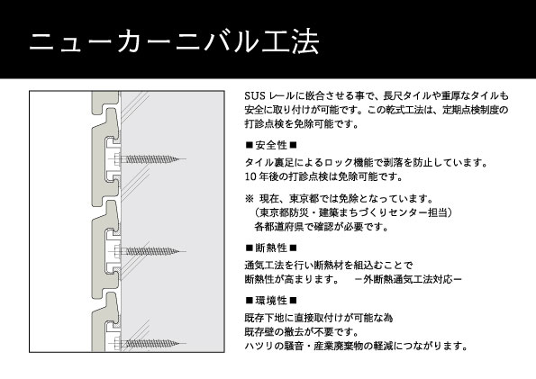 ニューカーニバル工法は、タイルを金物*レール(*材質はステンレスや高耐食性メッキ鋼板等)に嵌合させて固定する乾式工法です。モルタルを使用しないため、長尺タイルや重厚なタイルでも安全かつ高精度に取り付けることが可能です。また、タイル裏足のロック機構により剥落を防止し、定期打診点検の免除にも対応しています。